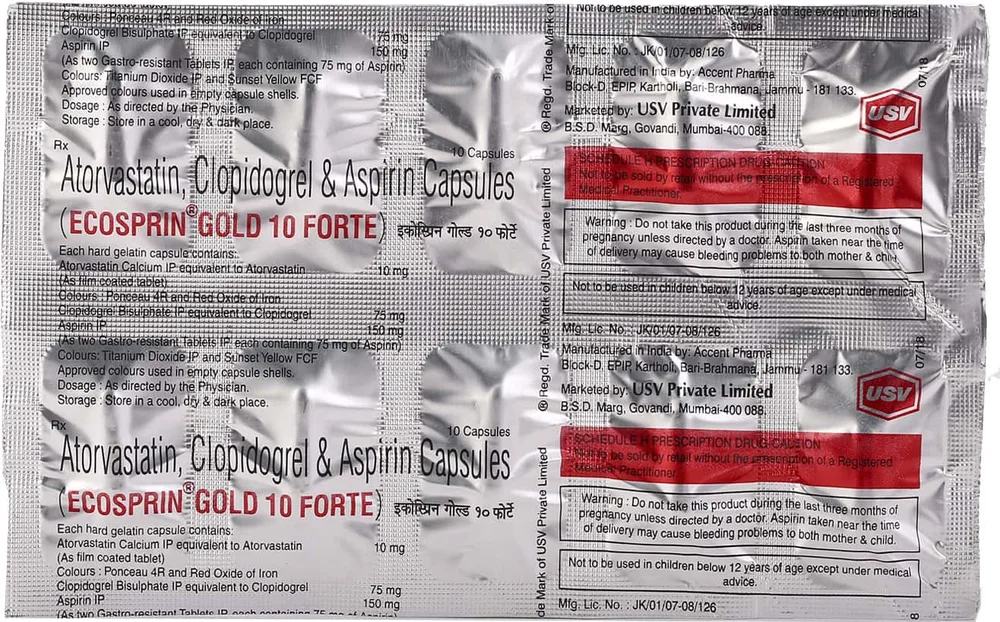 Ecosprin Gold Forte Capsule is a combination medicine used to reduce the risk of heart disorders like heart attack and chest pain. It contains three active ingredients-atorvastatin, clopidogrel and acetylsalicylic acid as an active ingredient. This combination is used to prevent heart disorders like heart attack and chest pain.