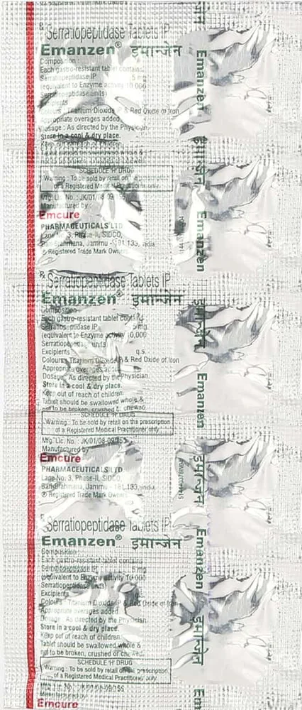 Emanzen Tablet is used to provide relief from inflammation,swelling and pain in various conditions. Emanzen Tablet contains serratiopeptidase, an enzyme that works by blocking the release of chemical substance released in the body during inflammation. Take this medicine as advised by your doctor.