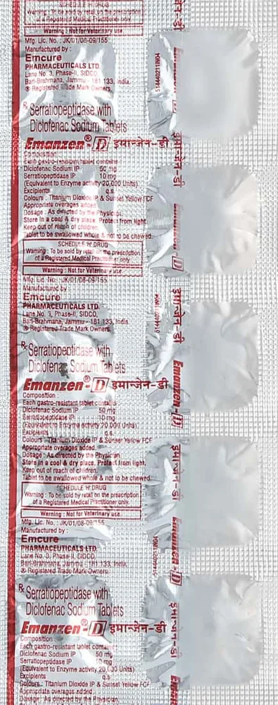 Emanzen D Tablet is a combination medication primarily used for the management of pain and inflammation in various musculoskeletal and inflammatory conditions, such as arthritis, postoperative pain, toothaches, headaches, and muscle injuries. It contains two active ingredients: diclofenac sodium, a non-steroidal anti-inflammatory drug (NSAID), and serratiopeptidase, a proteolytic enzyme. Diclofenac acts by inhibiting the synthesis of prostaglandins, which are chemical mediators responsible for pain, swelling, and inflammation, thereby reducing discomfort and improving mobility.