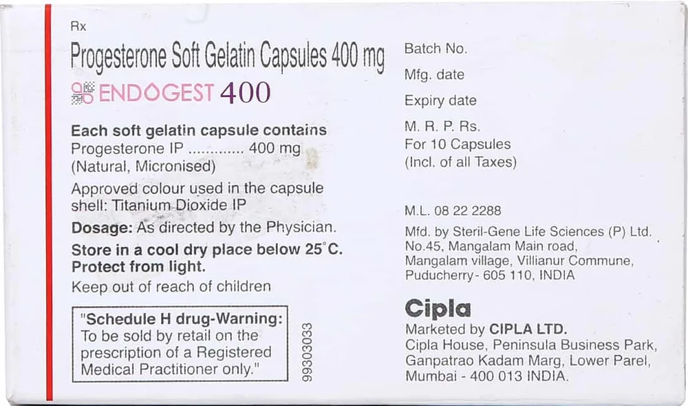 Endogest 400 Capsule is a medicine containing micronized progesterone, a man-made version of the natural female hormone essential for regulating the menstrual cycle and supporting pregnancy. This medicine is prescribed to address various gynaecological disorders and conditions that arise from insufficient levels of progesterone in your body. It works by supplying the necessary amount of this hormone and mimicking its natural actions, thereby helping to correct hormonal imbalances.