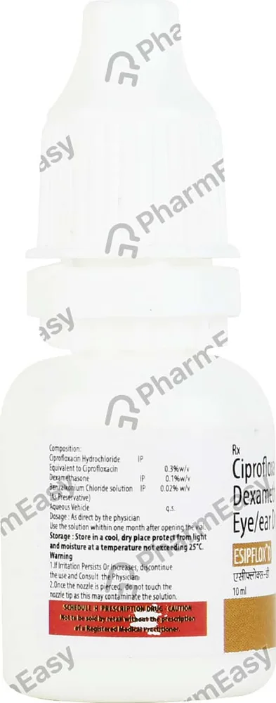 Esipflox D eye/ear drop contains a combination of two medicines: Dexamethasone (steroid) and Ciprofloxacin (antibiotic). It is used to treat inflammation and swelling in the eyes after surgery or an operation. It is also used to treat bacterial infections of the eye.