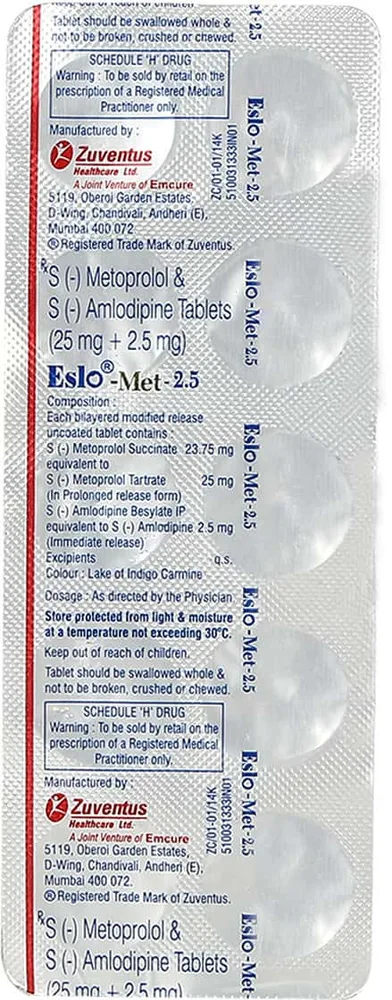 Eslo Met Tablet is a combination medicine used for the treatment of high blood pressure, angina pectoris (chest pain due to reduced blood flow to the heart). It contains amlodipine and metoprolol as thier active ingredients. It is also used for the treatment of coronary heart diseases (a heart condition where blood vessels supplying blood to your heart muscle gets narrowed).
