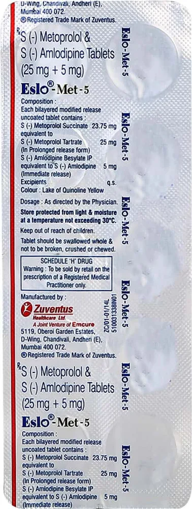 Eslo Met Tablet is a combination medicine used for the treatment of high blood pressure, angina pectoris (chest pain due to reduced blood flow to the heart). It contains amlodipine and metoprolol as thier active ingredients. It is also used for the treatment of coronary heart diseases (a heart condition where blood vessels supplying blood to your heart muscle gets narrowed).