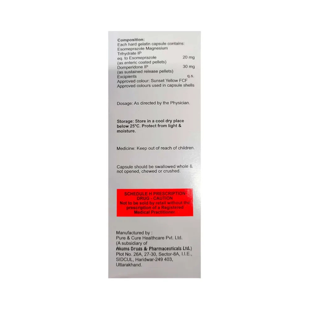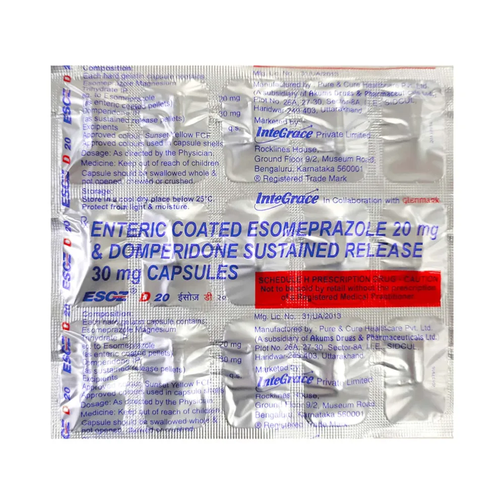 It works by reducing the production of stomach acid and increasing the motility of the stomach and intestines, thus preventing acid from flowing back into the esophagus. Esoz D Capsule should be taken at least one hour before meals, as directed by your doctor. While using this medication, avoid foods that may increase acidity, do not lie down immediately after meals, and make sure your last meal is at least two hours before bedtime.