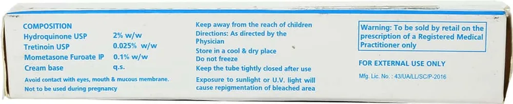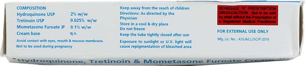 Eukroma Cream is a combination medicine used in the treatment and prevention of moderate-to-severe melasma (dark and discoloured patches on the skin) to lighten the skin tone or appearance and senile lentigines (dark spots or age spots in older people due to exposure to the sun). It contains mometasone, tretinoin and hydroquinone. Avoid sun exposure immediately after applying for this medicine.