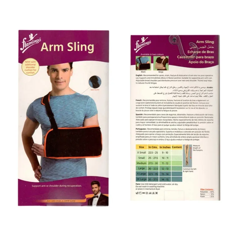 - Design: A Flamingo arm sling is usually made of lightweight, breathable, and adjustable materials such as fabric or nylon. The design of the sling ensures proper support and immobilization of the arm while allowing for comfort and ease of use.