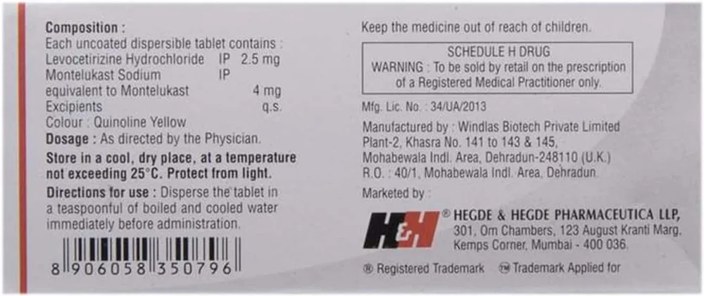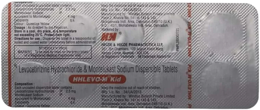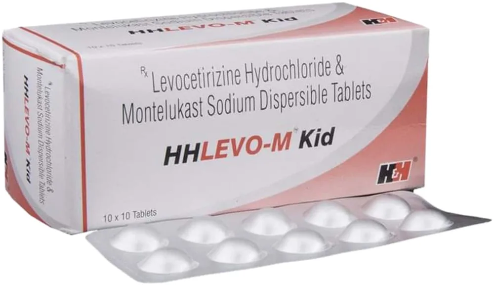 Hhlevo M Kid Tablet contains a combination of montelukast and levocetirizine as its active ingredients. It is used to provide relief from allergic rhinitis, including a runny or stuffy nose, airway blockage, sneezing, itching, watery eyes, and other allergic symptoms. Hhlevo M Kid Tablet blocks the release of chemical substances, such as histamine and leukotrienes, responsible for these allergic reactions.