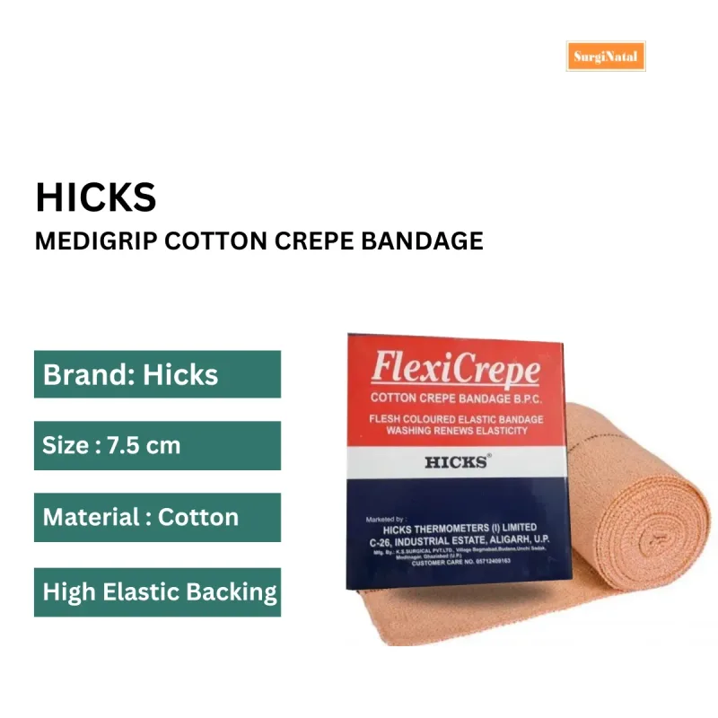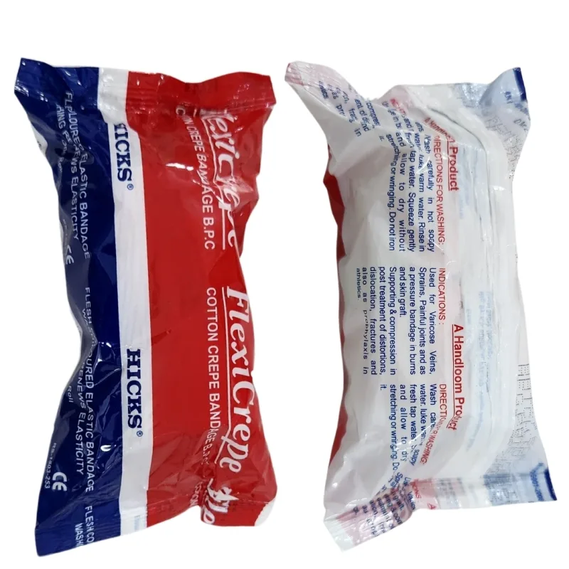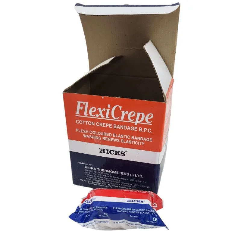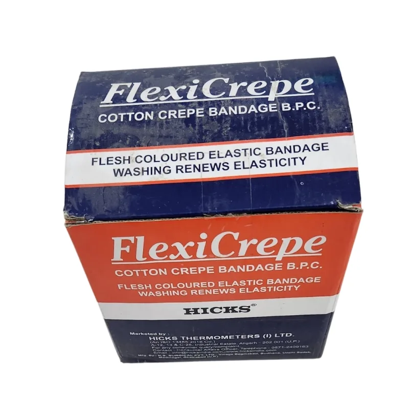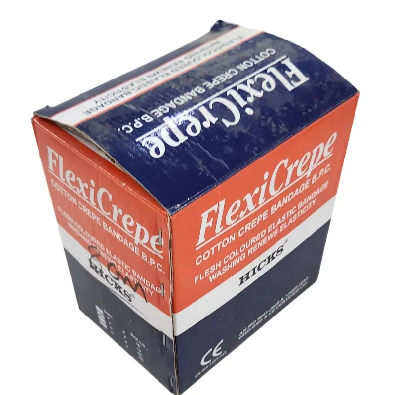 Hicks Flexicrepe Cotton Crepe Bandage B.P.C is a medical Grade, stretchable bandage designed to provide firm support and compression for injured muscles and joints. It is made from superior cotton material, it offers excellent elasticity, allowing it to conform comfortably to different body parts.