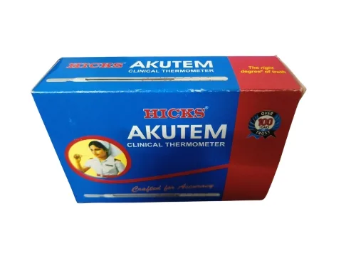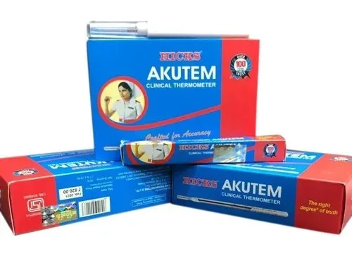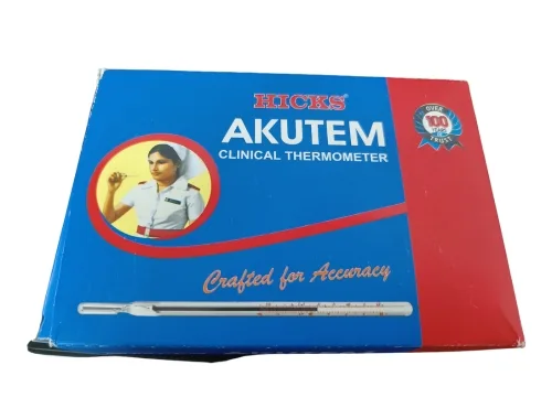 Buy the Hicks Akutem Clinical Thermometer for precise and reliable temperature measurements. This high-quality mercury thermometer features imported white capillary glass tubing, ensuring accurate readings within the range of 35ºC to 42ºC (94ºF to 108/110ºF). Its clear scale allows for easy reading and the durable design makes it a dependable choice for clinical and home use.