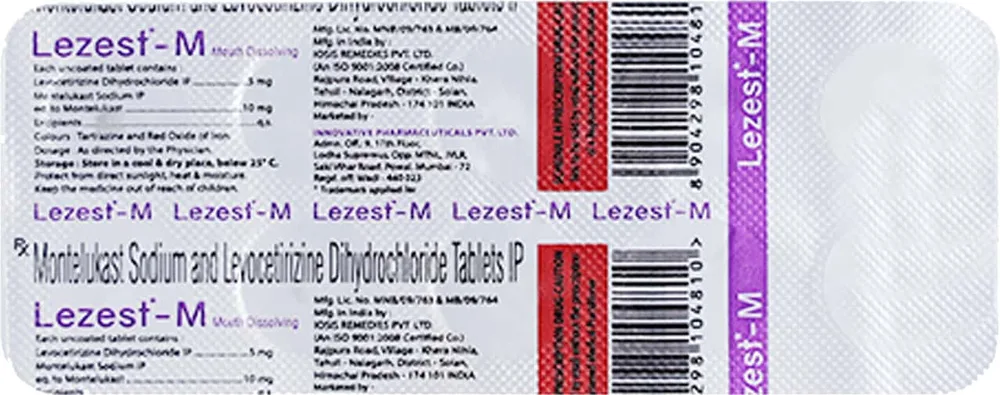 Lezest Md M Tablets contains a combination of montelukast and levocetirizine as its active ingredients. It is used to provide relief from allergic rhinitis, including a runny or stuffy nose, airway blockage, sneezing, itching, watery eyes, and other allergic symptoms. Lezest Md M Tablets blocks the release of chemical substances, such as histamine and leukotrienes, responsible for these allergic reactions.