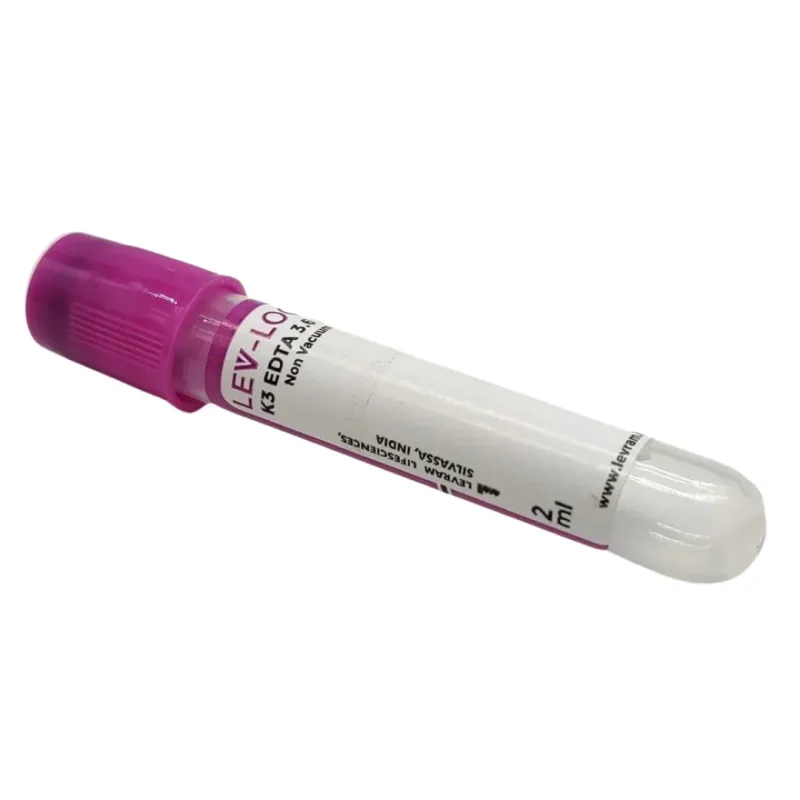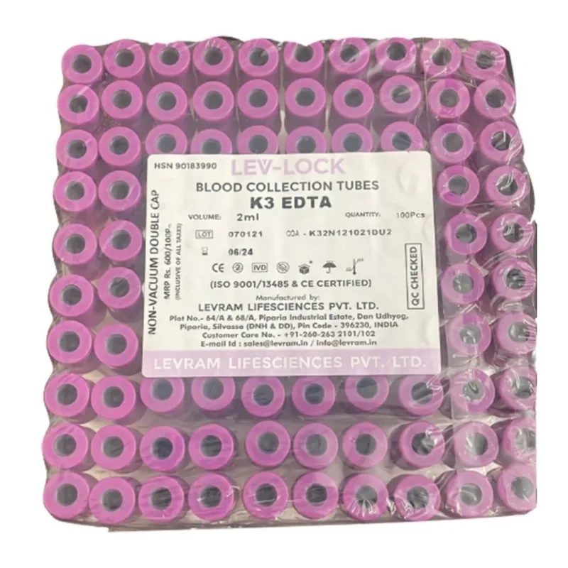 Lev-Lock Blood Collection tubes (K3Edta) are the best for manual blood testing design, with high-quality materials that ensure the safe and relatable results of the samples. These are mainly used in hospitals and clinical laboratories for matching, blood grouping, and other blood cell tests without vacuum and additives.