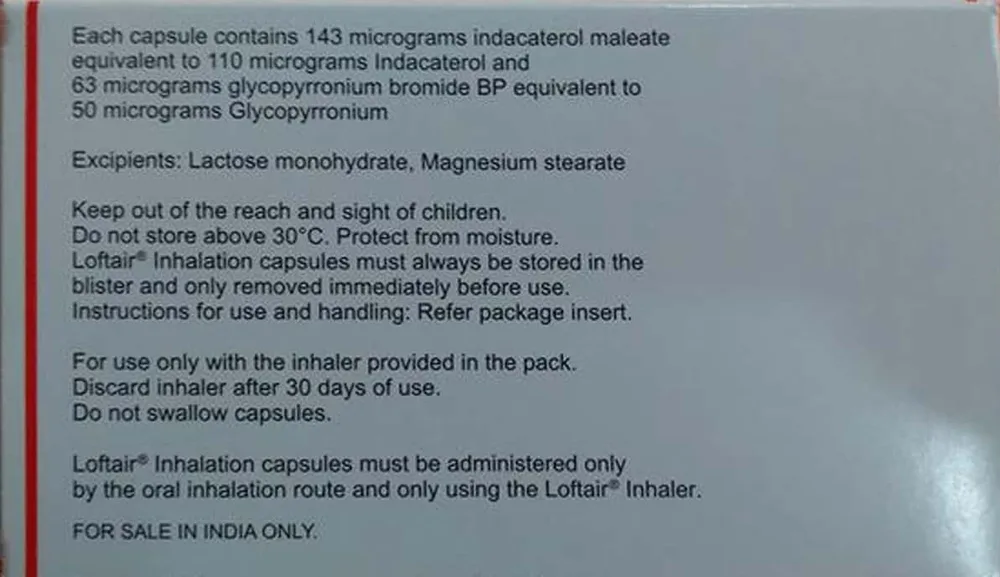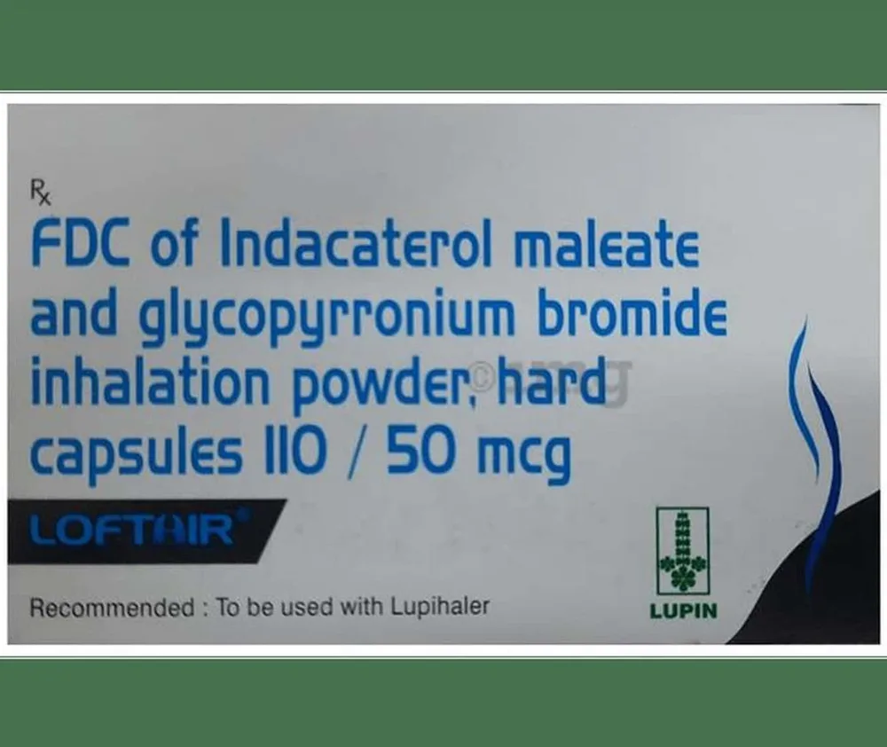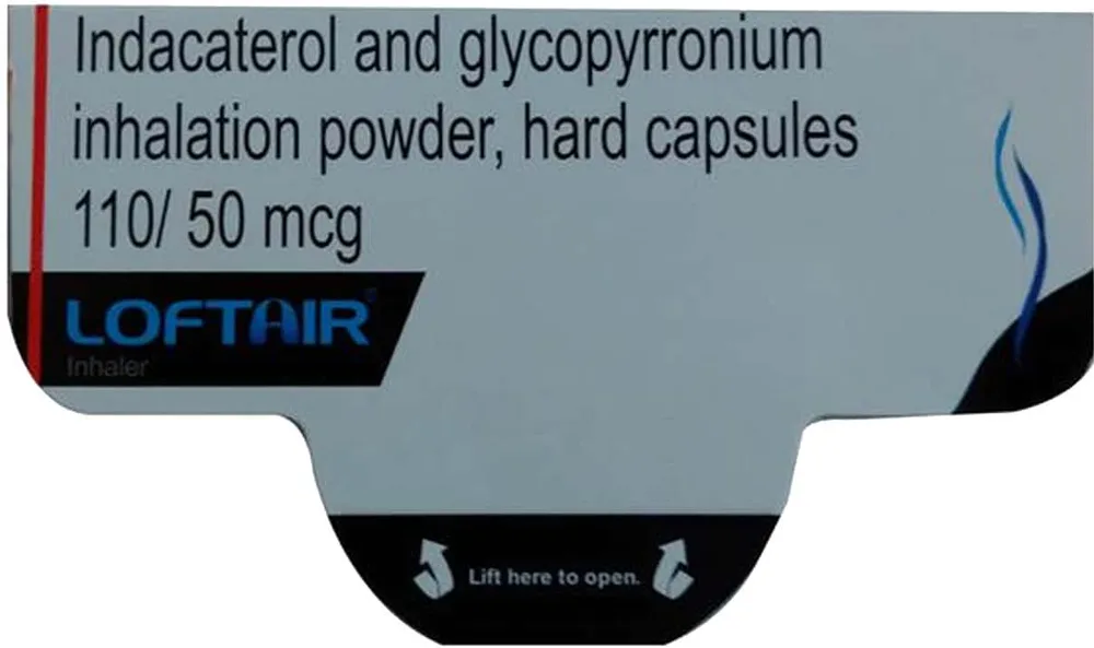 Loftair Inhalation Capsule is a medicine used for the maintenance treatment of airflow obstruction in patients with COPD (a lung condition that obstructs airflow to the lungs making breathing difficult). It helps in controlling the symptoms such as wheezing and breathing difficulty. Loftair Inhalation Capsule contains Indacaterol and Glycopyrrolate as its main ingredient.
