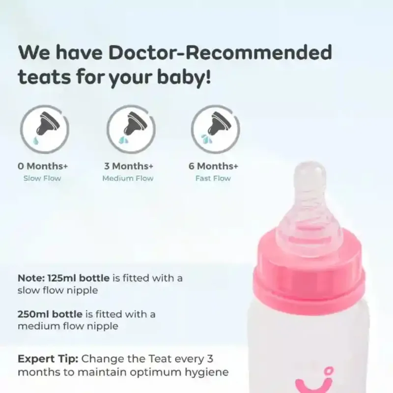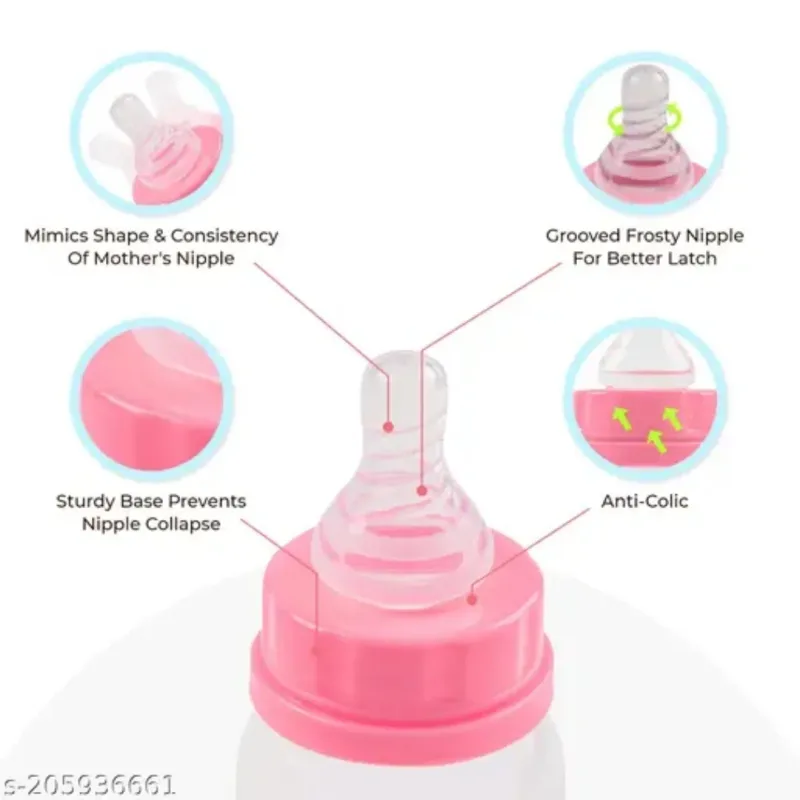 It comes with an advanced anti colic valve system to minimize air intake during feeding. It has frosty grooves, a breast like nipple for better latch and a cap which stores and prevents leakage.