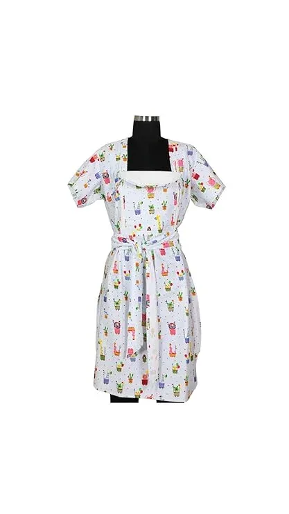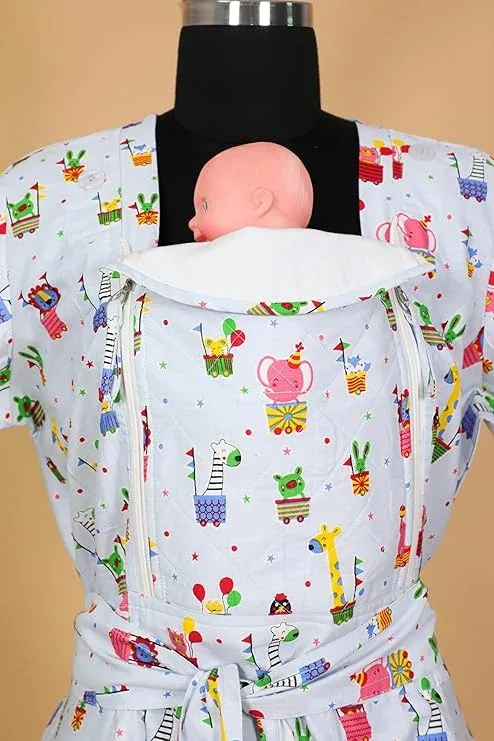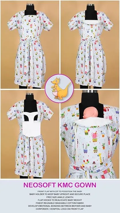 The multicolour print adds a cheerful, vibrant touch—bringing warmth and positivity to what can often be a stressful or clinical environment, such as a neonatal intensive care unit (NICU) or hospital maternity ward. Its design typically includes front openings with either adjustable Velcro, snap buttons, or tie closures that allow for quick and easy placement of the baby onto the parent’s chest. The gown can be secured snugly around the baby to provide support without the need for constant hand-holding, giving the mother the freedom to rest, breastfeed, or move gently while still holding her child.