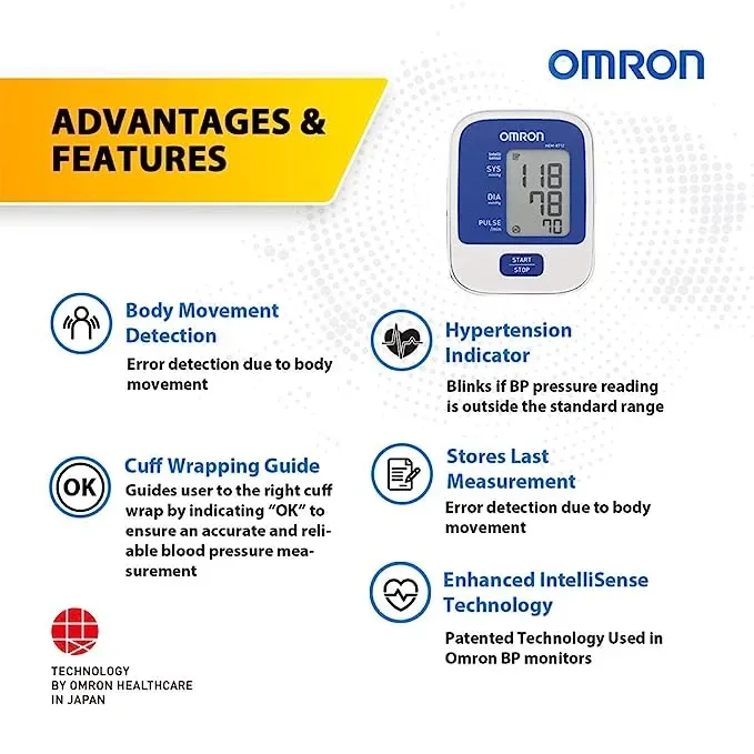 Omron HEM 8712 BP Monitor is a compact home BP monitoring device that allows users to conveniently monitor their blood pressure at home with the help of a single-touch operation. It comes equipped with the benchmark Enhanced Intellisense Technology, powered by an algorithm that enhances measurement accuracy with a standard deviation of less than 4 mmHg.