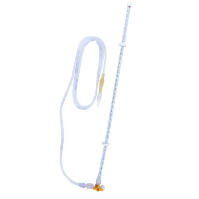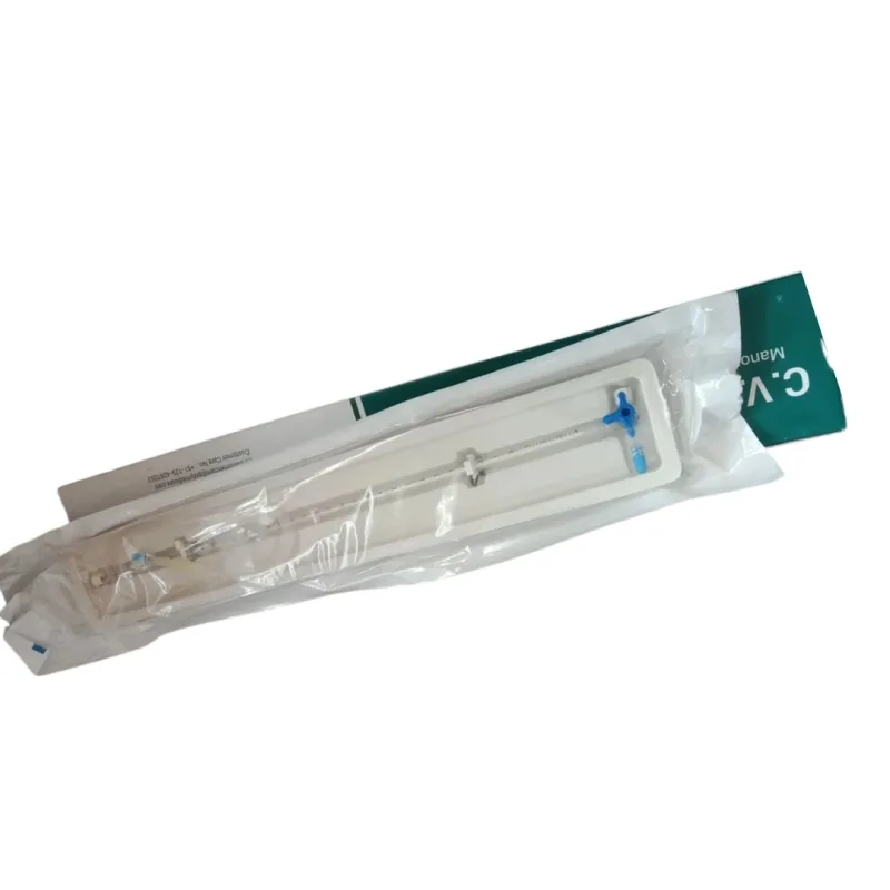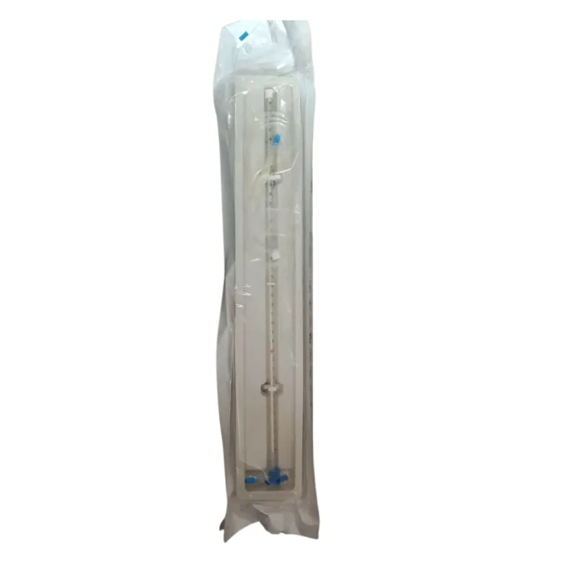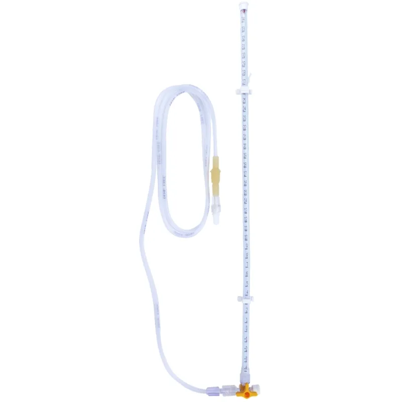 It comes with a clear, easy-to-read graduated tube that ensures precise measurement, making it an essential tool in critical care and intensive monitoring. It also has a graduated tube marked from -4 cm to +34 cm, securely attached to a three-way stopcock for easy control and secure connection.