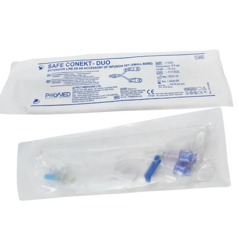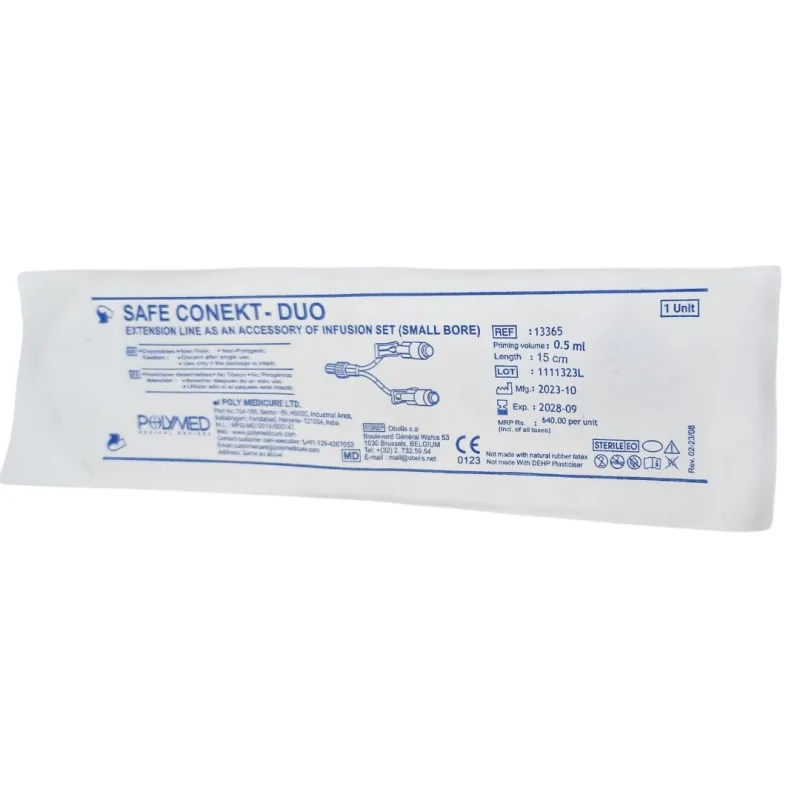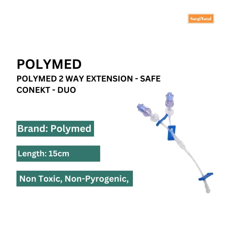 Polymed 2 Way Extension – Safe Conekt Duo is a medical grade user-friendly extension tube used for the safe administration of IV fluids and medications. It has a large bore 15 cm extension tube with a needle-free connector that helps reduce the risk of bacterial contamination during use.