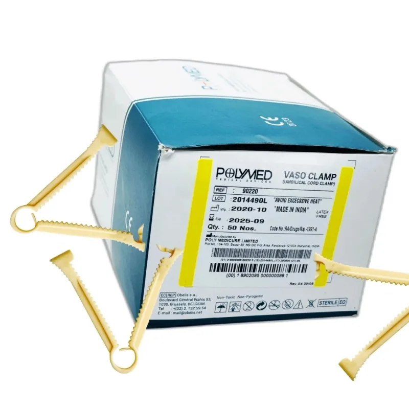 Polymed Umbilical Cord Clamp- Vaso clamp is a medical device used to secure and manage the umbilical cord immediately after the baby's birth. The clamp helps in slipping off the umbilical.