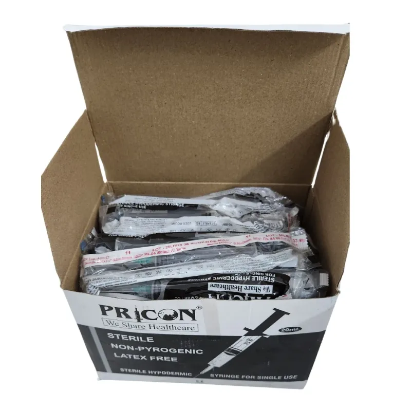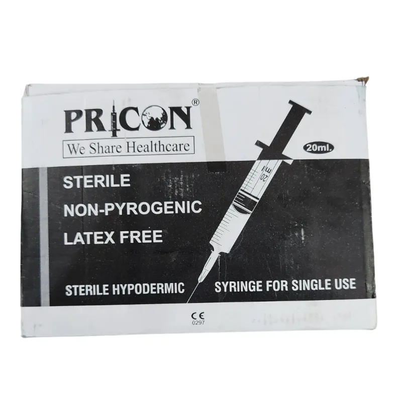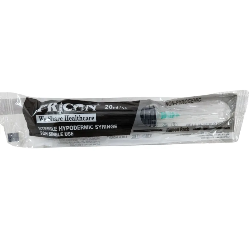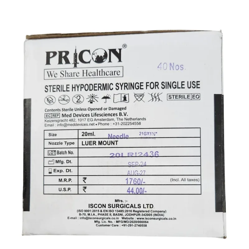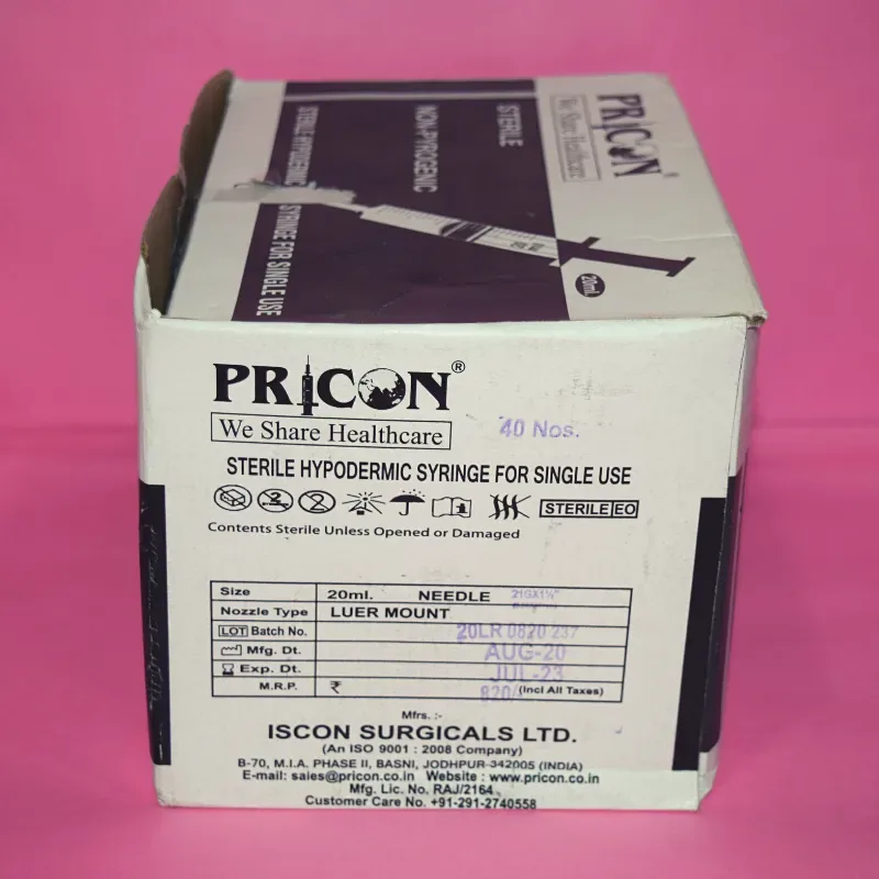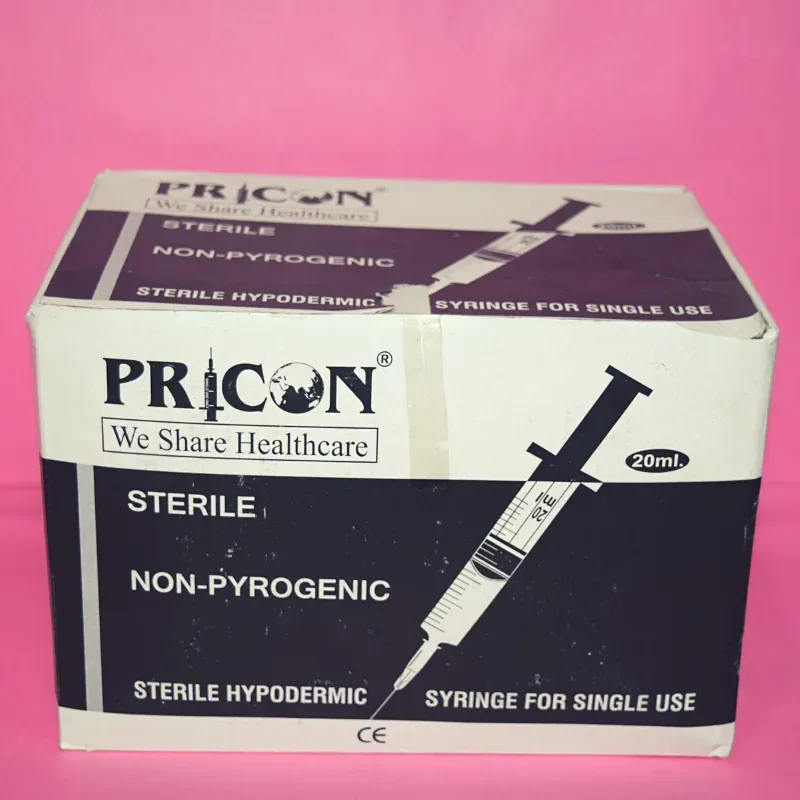 Pricon Sterile Hypodermic Syringe with Needle Single Use 20 ml is a medical device used to deliver fluid medicine into the patient's body. It is made of medical grade hypodermic material which means not made with latex, BPA, DEHP or PVC.