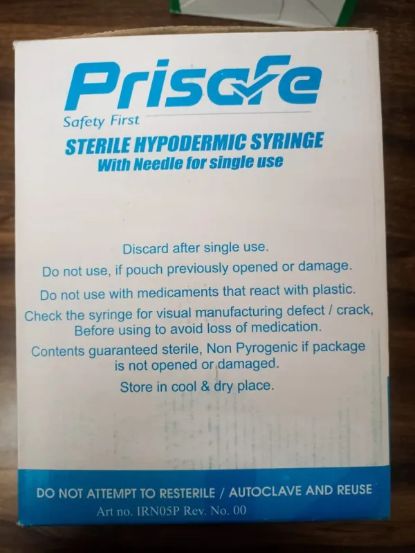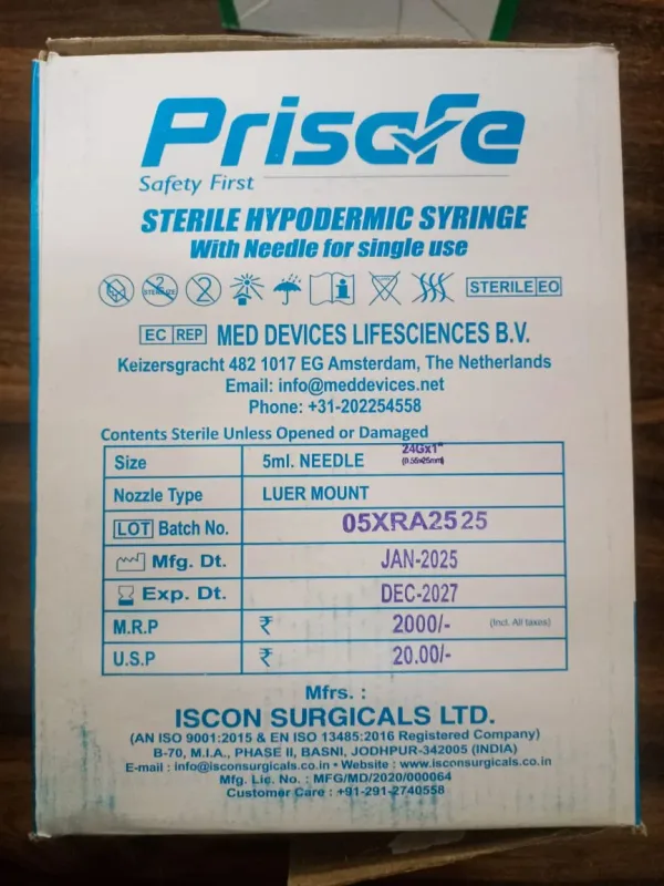 Pricon Sterile Hypodermic Syringe with Needle Single Use 5 ml is a medical device used to deliver fluid medicine into the patient's body. It is made of medical grade hypodermic material which means not made with latex, BPA, DEHP or PVC.
