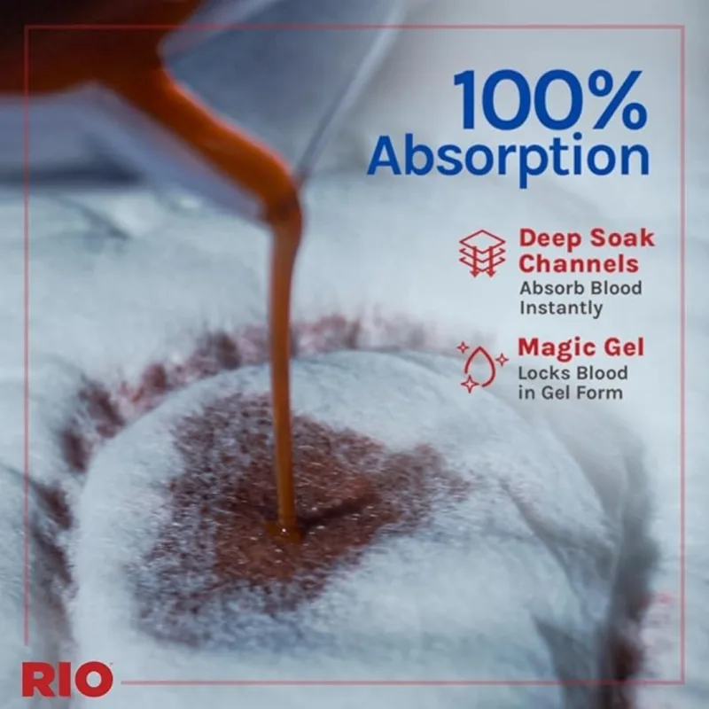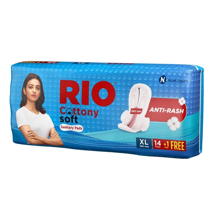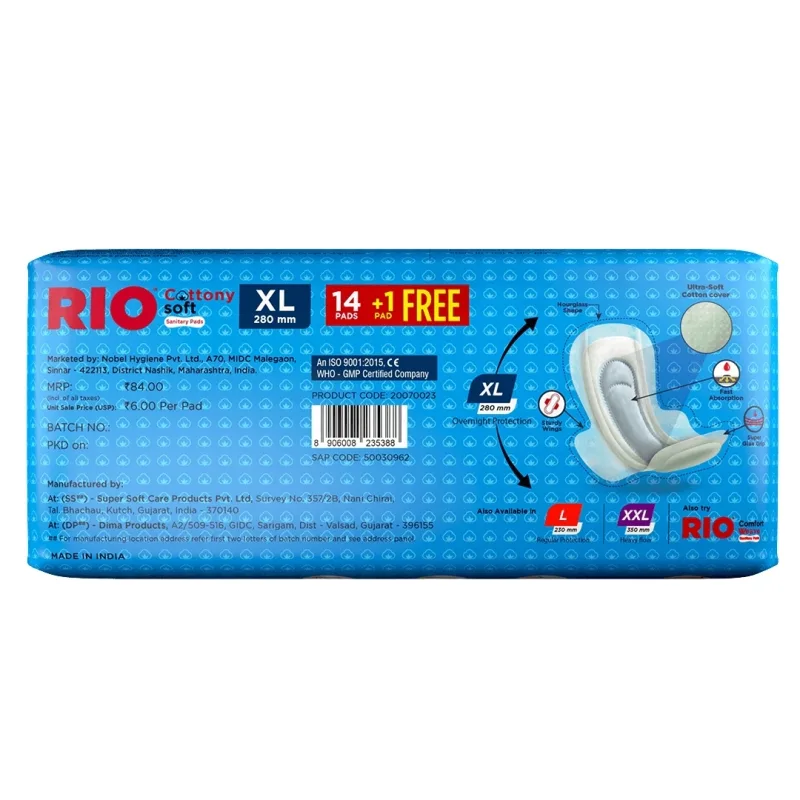 RIO Cottony Soft Sanitary Pads XL -14+1 Pcs is made of natural cotton and is also known as an absorbent pad or sanitary napkin used to absorb menstrual blood.