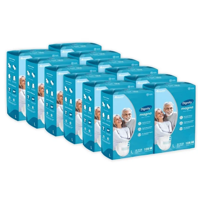 Dignity Magna is an open-style adult diaper with adjustable tabs that guarantee a customized fit for the wearer. With a Leakage Protection promise for up to 8-10 Hours, Dignity Magna is designed for urinary and fecal incontinence in both men & women.