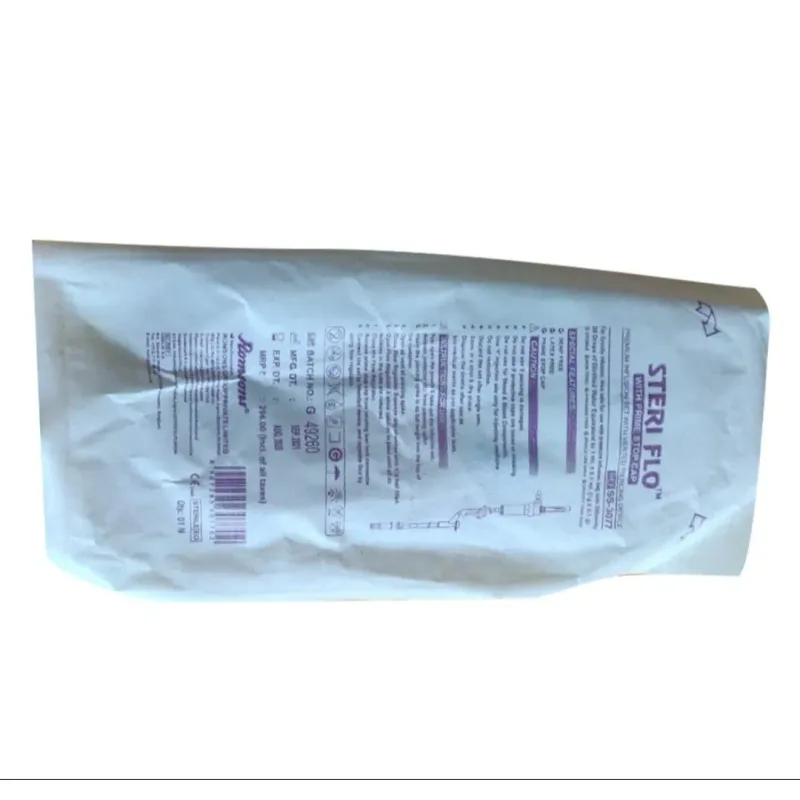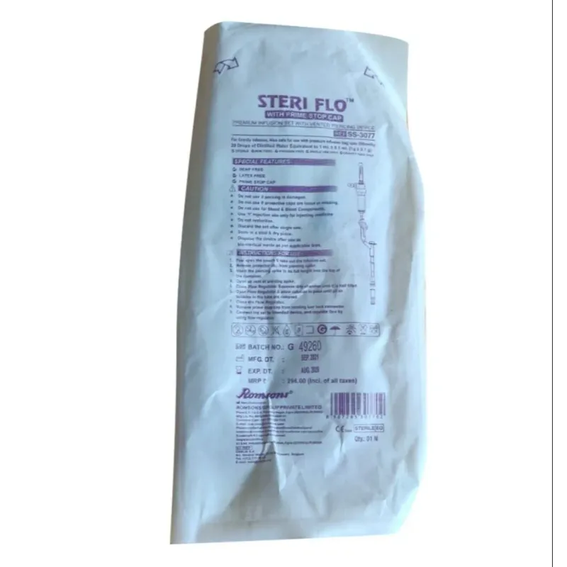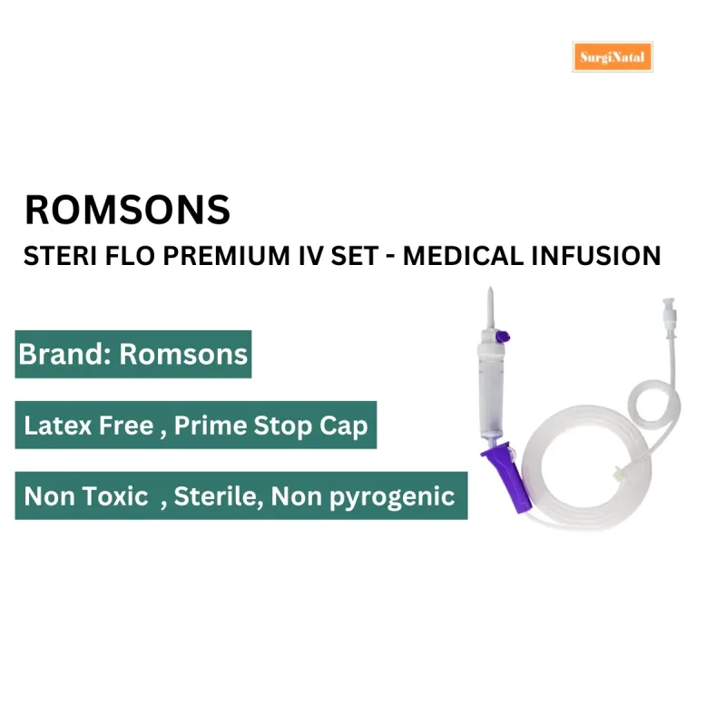 Romsons Steri Flo Premium IV Set is a high-quality infusion set used for safe and smooth intravenous fluid administration. It comes with a sharp piercing spike, allows easy insertion into IV containers, ensuring a hassle-free setup. Its vented design with a 1.