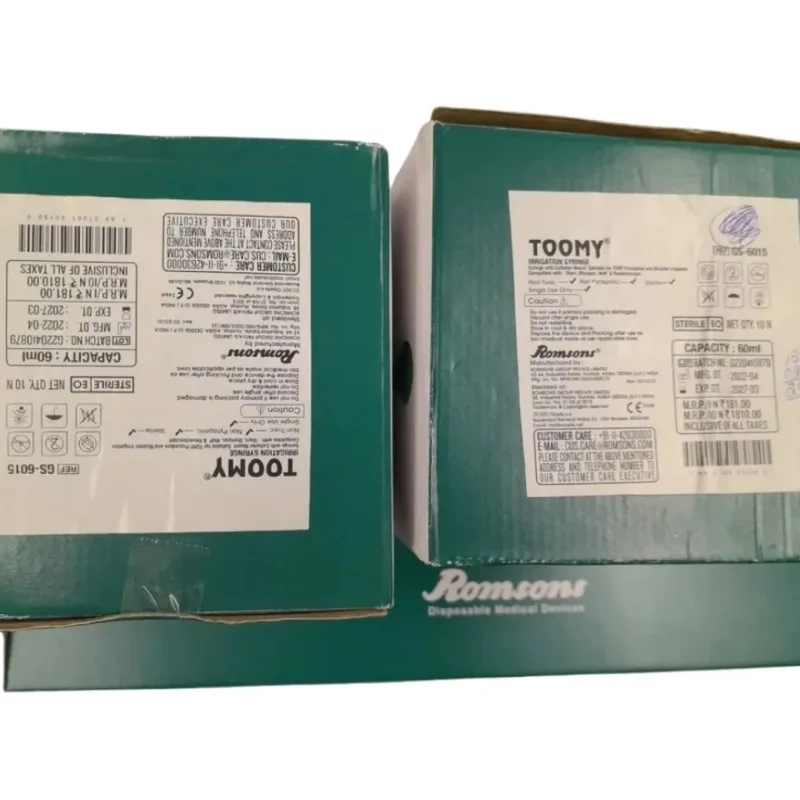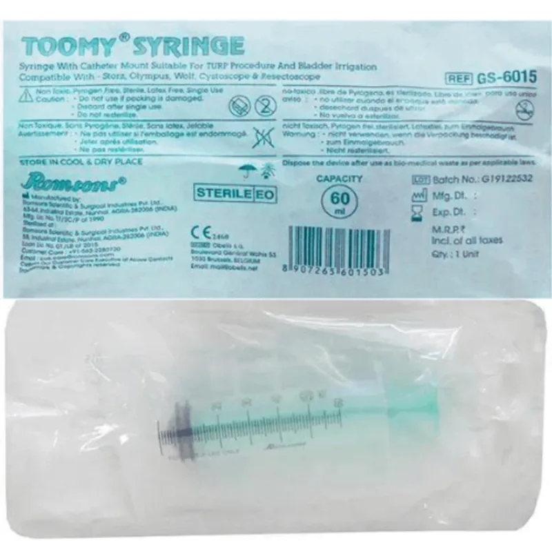 Romsons Toomey Syringe With Catheter Mount 60ml, also known as TURP Glass Syringe, is a medical device used for bladder irrigation in urology procedures, wound irrigation and flushing body cavities, and in surgical setups where large-volume fluid transfer is required.