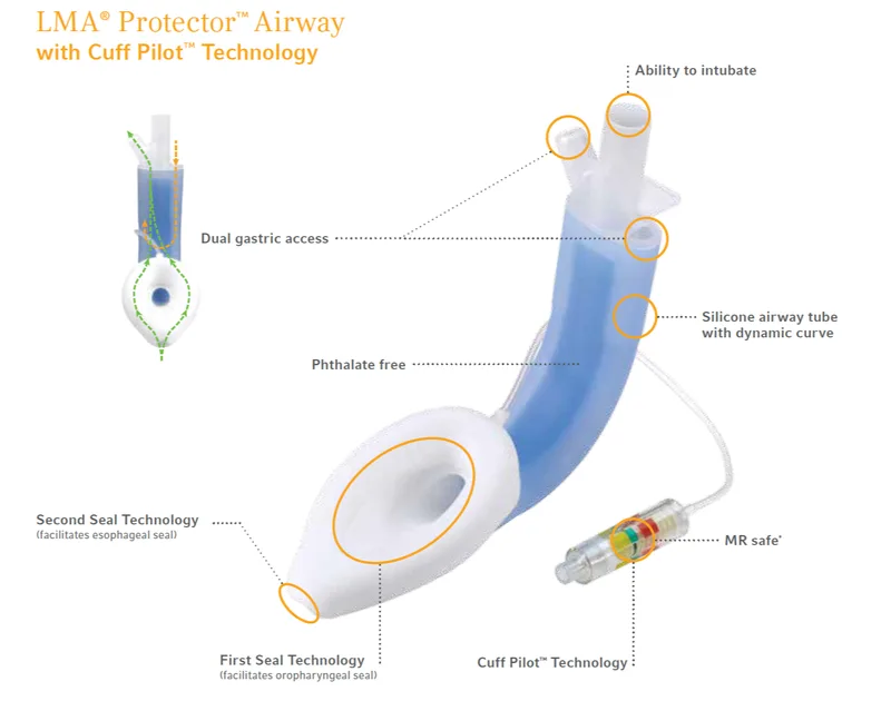 The LMA Protector Airway is a single use second generation device which features an innovative dual gastric access channel, and a true Second Seal Technology with the upper oesophageal sphincter. It allows direct intubation using visual guidance.