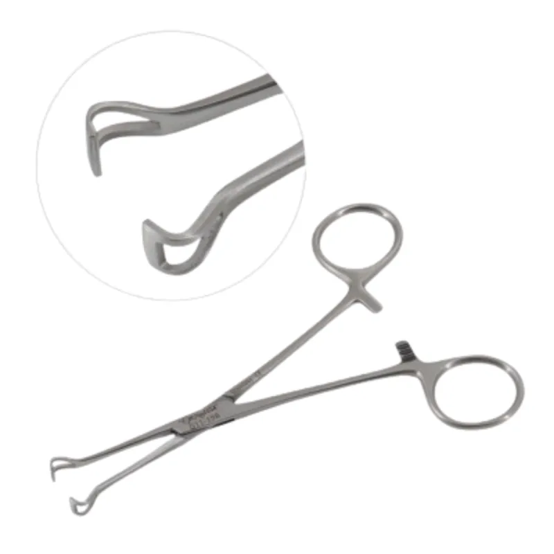 The jaws are circumferential, and the tips are triangular and fenestrated with horizontal serrations. They are particularly useful for grasping tube-shaped structures.