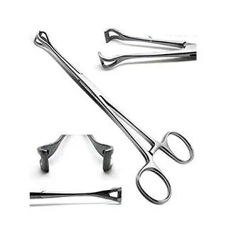 Babcock Forceps are finger ring, ratcheted, non-perforating forceps used to grasp delicate tissue. They are frequently used with intestinal and laparotomy procedures. Babcock Forceps are similar to Allis forceps; however, may be considered less traumatic due to their wider, rounded grasping surface.
