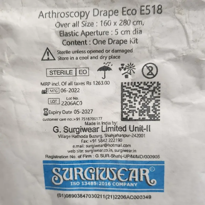Benefits: Maintains Sterile Surgical Field: Surgiwear Arthroscopy Drape plays a crucial role in maintaining a sterile surgical field during arthroscopic procedures. This is essential for preventing infections and ensuring the success of the surgical intervention. Enhances Surgical Visibility: The clear incise film ensures enhanced visibility of the arthroscopic field, allowing surgeons to work with precision and accuracy.