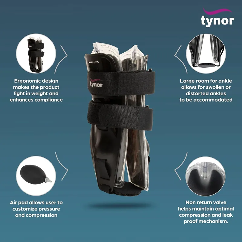 Tynor Air Ankle Splint is expertly designed to immobilize, stabilize, and protect the ankle following injuries such as sprains, ligament tears, or chronic ankle instability. Its unique air-cushioned design adapts to the natural contours of the ankle, offering personalized compression and increased comfort during recovery.