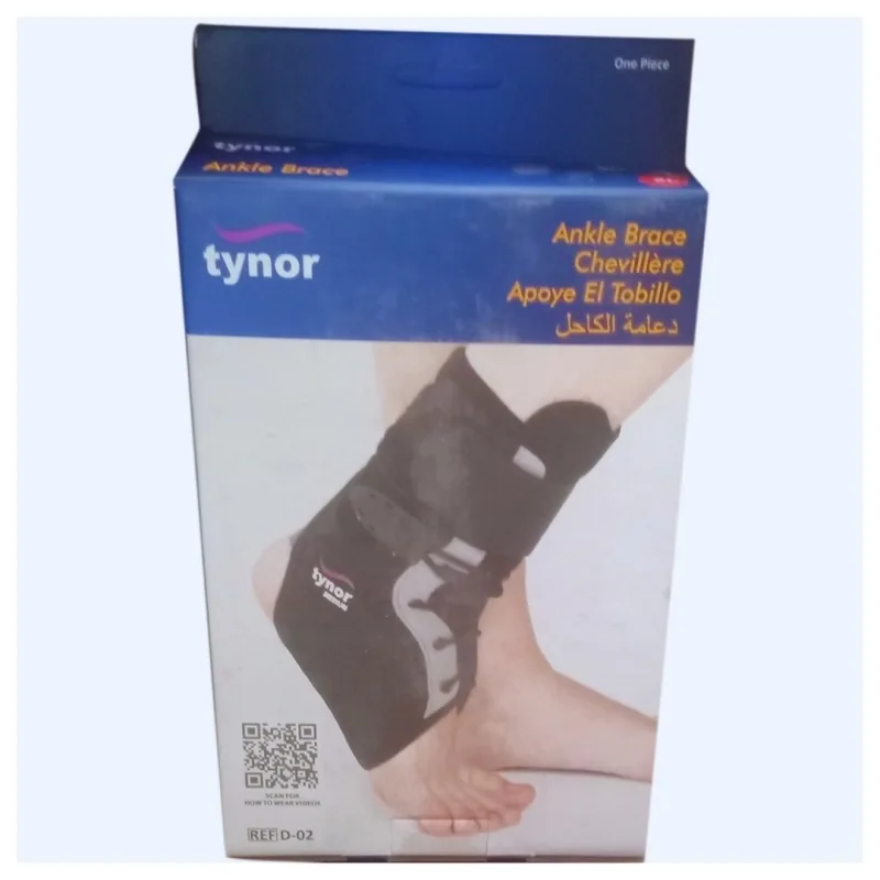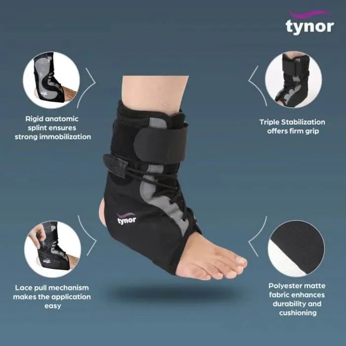 Tynor Ankle Brace is used to support, stabilize, and restrict excessive movement of the ankle joint, making it ideal for individuals recovering from injuries or those prone to ankle sprains. It provides triple stabilization through hook-loop closures, lace tightening, and rigid splints, ensuring firm protection and optimal support.