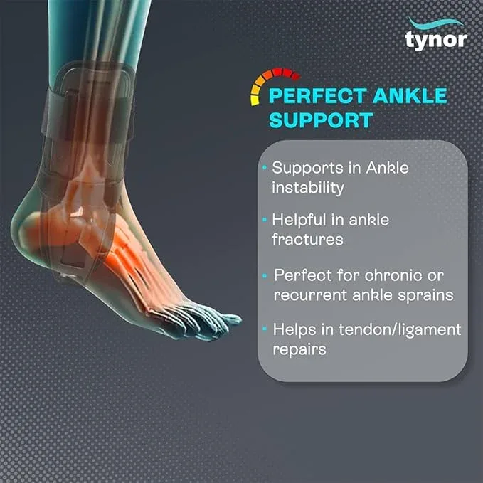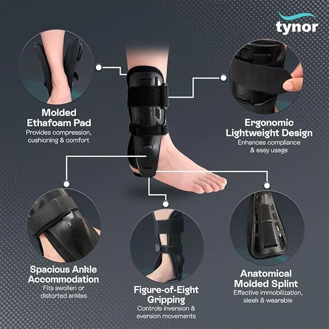 Tynor Ankle Splint is used to provide firm immobilization, stability, and protection to the ankle joint during injury, recovery, or for individuals prone to frequent sprains. Its rigid exoskeleton shell ensures superior control over ankle movements, especially inversion and eversion, making it ideal for ligament injuries, post-surgical support, and acute ankle sprains.