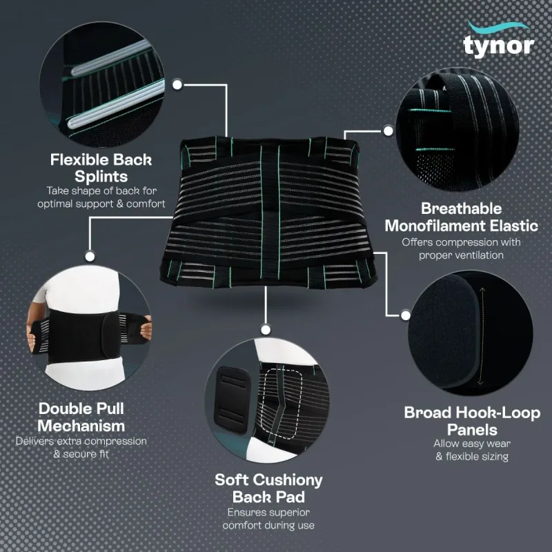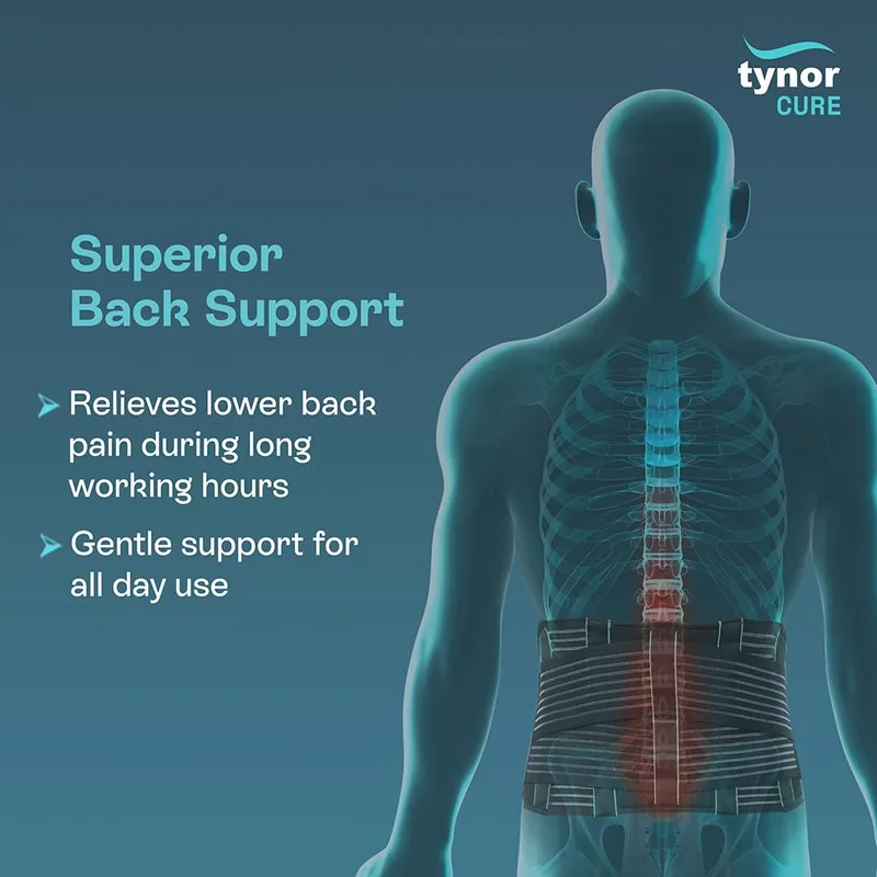 Tynor Back Support Belt is a scientifically designed support that helps provide relief from low back pain while allowing comfortable movement during daily activities. It is ideal for regular use as well as a preventive (prophylactic) aid for people prone to back strain due to prolonged sitting, standing, or physical work.
