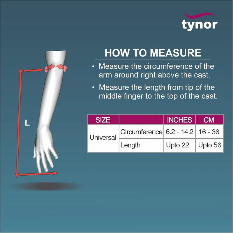 Tynor Cast Cover Arm Universal is a reusable, waterproof protector designed to keep casts, bandages, and wounds completely dry during bathing or showering. It provides a reliable watertight seal, ensuring protection from moisture without compromising comfort or mobility.