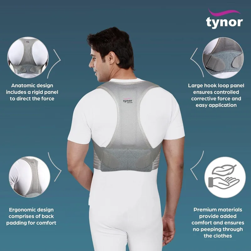 Tynor Posture Corrector is an effective orthopedic support designed to help maintain correct posture during daily activities, prolonged sitting, and desk work. It works by applying a gentle yet consistent correctional force that pulls the shoulders back and aligns the spine, reducing stress on the neck, shoulders, and upper back.