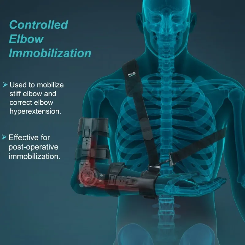 Designed to control and restrict the degree of flexion and extension of the elbow joint through a sophisticated dial system to allow a range of motion or immobilization of the elbow. Universal design allows it to be used on most of the patients and for multiple orthopedic problems.