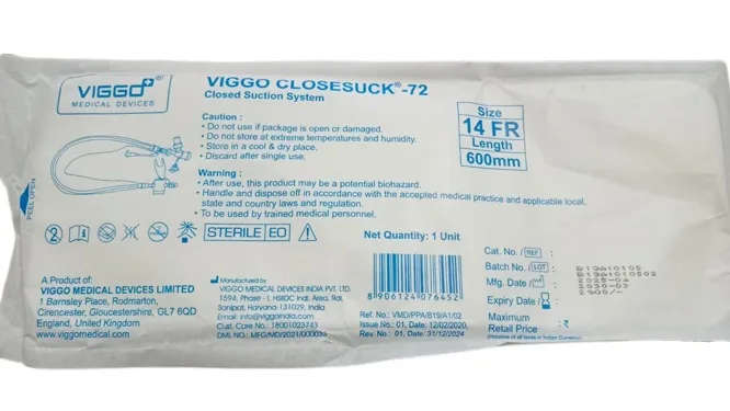 Viggo Closesuck-72 Closed Suction System is a medical suction device used for safe, hygienic airway suctioning in intubated patients. It is used with endotracheal (ET) tubes or tracheostomy tubes to remove secretions from the lower respiratory tract without disconnecting the ventilator circuit.